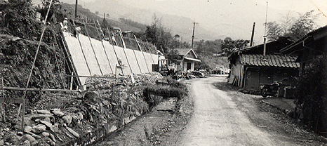 拡幅予定の県道富岡万場線町谷地区。昭和46年当時の様子です。総合公園Aグランド入り口の県道の北側は鬱蒼(うっそう)とした竹薮で、雨が降ると歩く場所もないくらいの大きな水たまりができました。定期バスが通行するとバスの横幅は道と同じくらいで、歩行者や自転車に乗る人はそのたびに怖い思いをする狭い道でした。