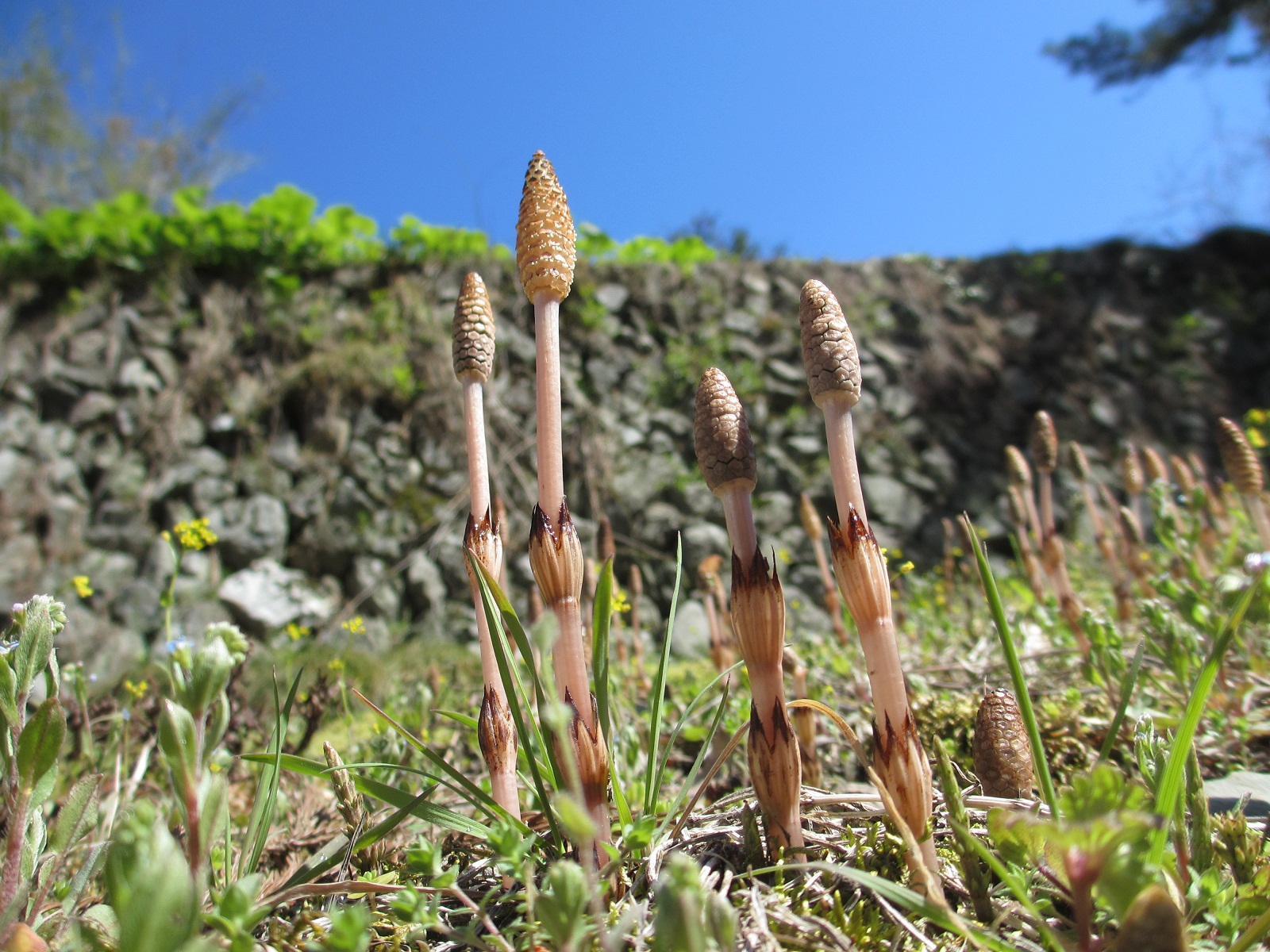 石垣の下では、「ツクシ」が背伸びして並んでいます。
